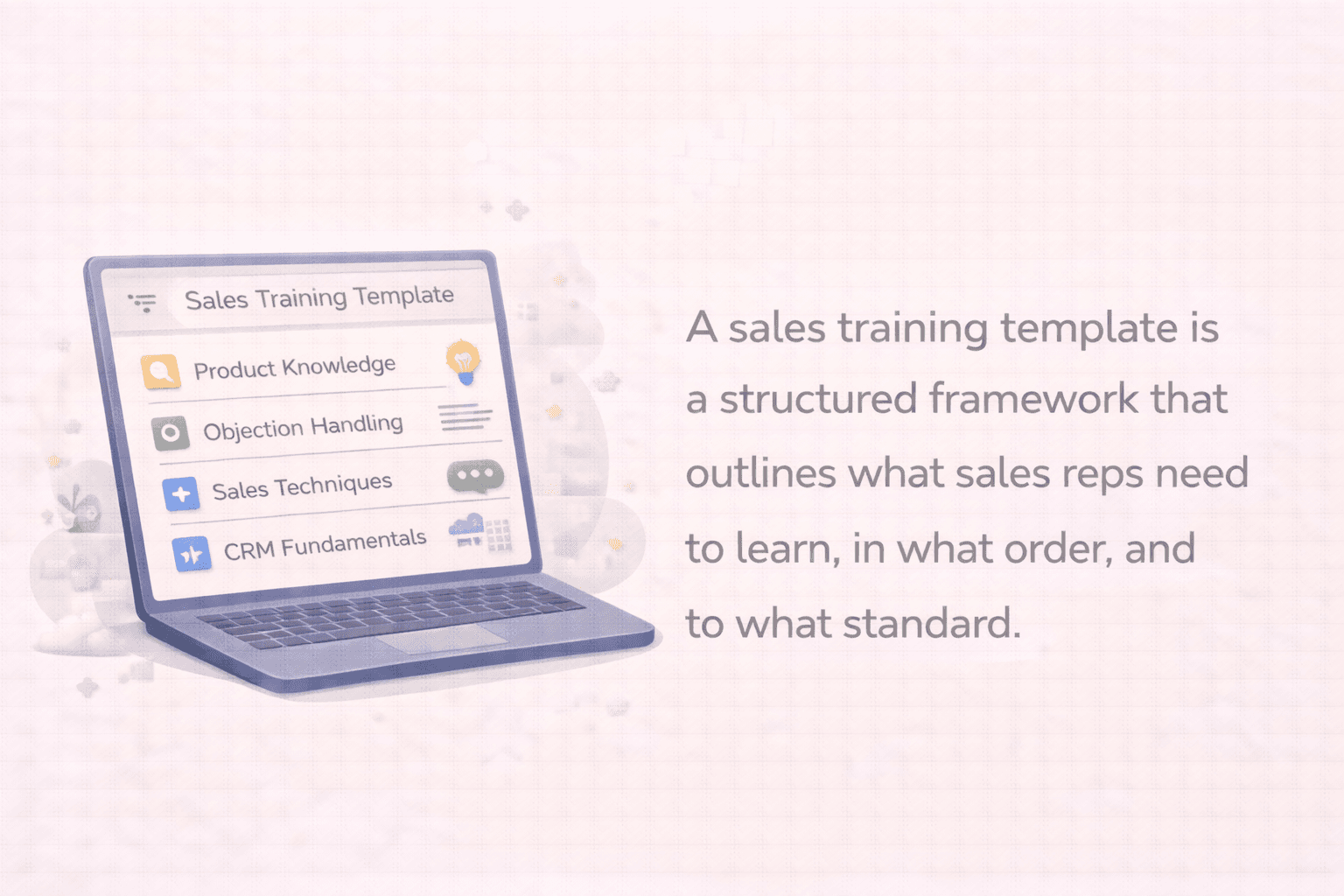 A sales training template is a structured framework that outlines what sales reps need to learn, in what order, and to what standard. Most cover key topics like: