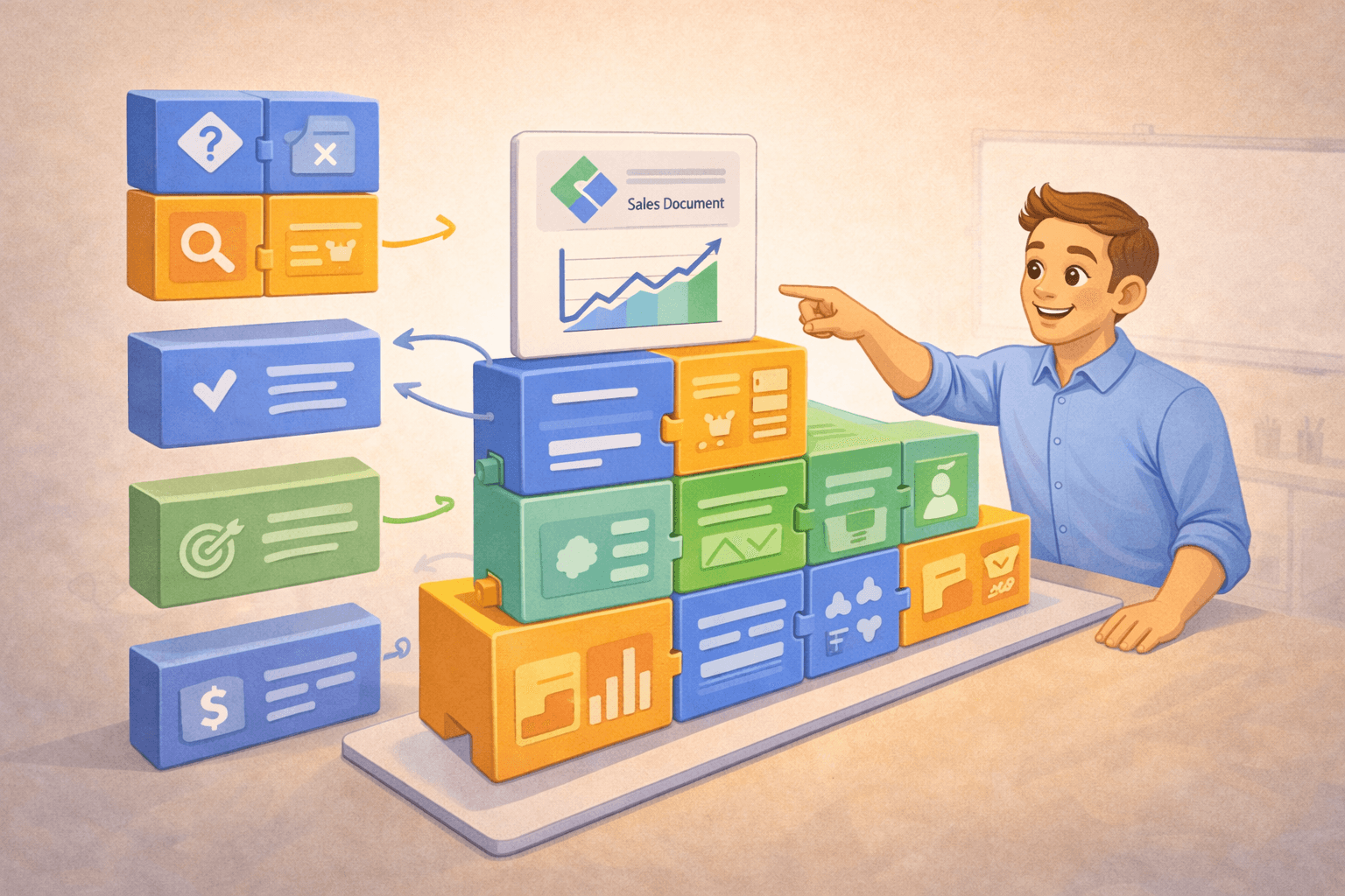The best templates are modular. Each focus area (prospecting, objection handling, closing) lives as its own unit. When something changes, you update that module. Everything else stays intact.
