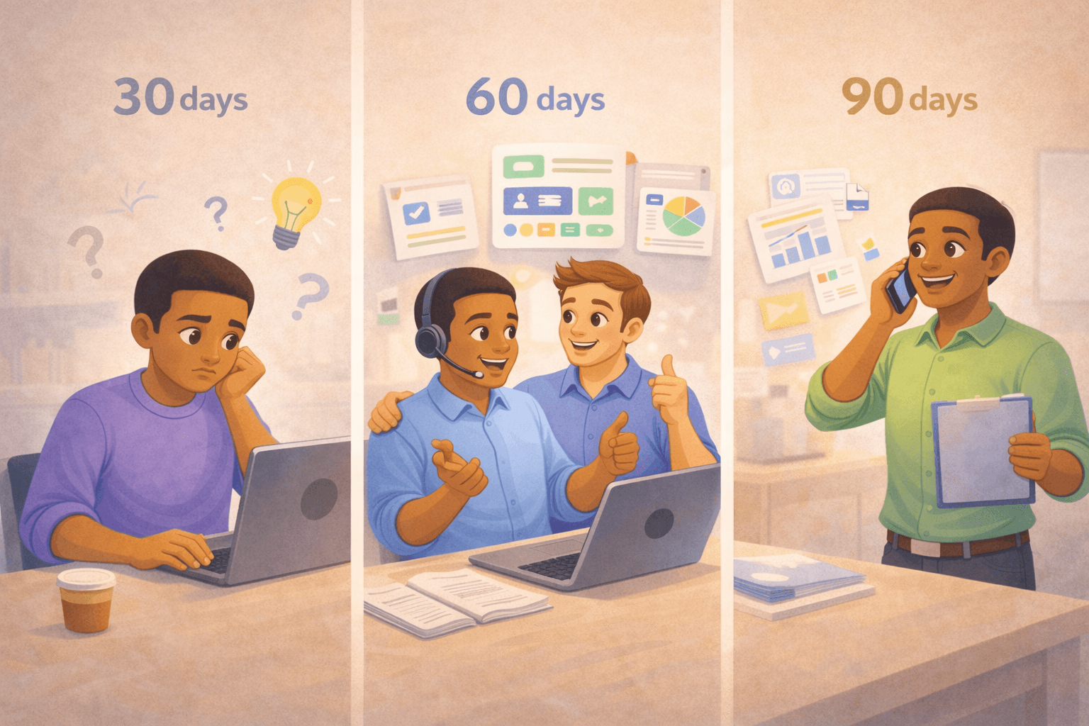 For example, a new sales rep's first 30 days, for example, might focus on product knowledge, CRM basics, and shadowing discovery calls. Days 31-60 shift to running their own calls with manager support. By day 90, they're carrying a full pipeline independently.