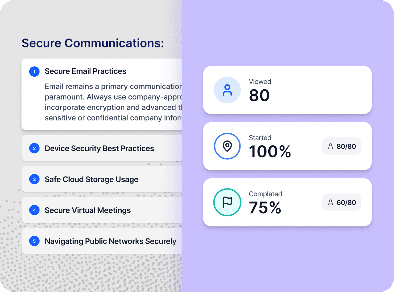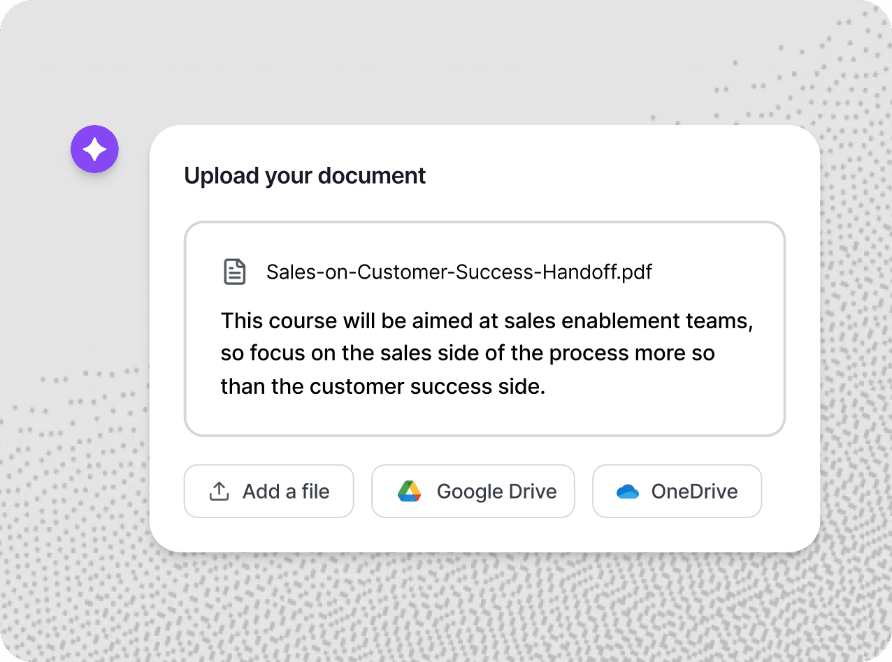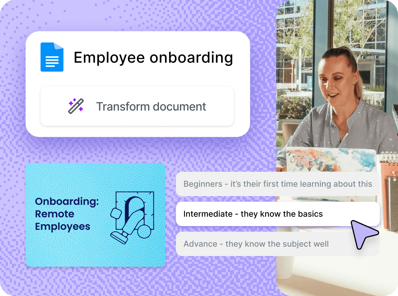 Transform your org's existing knowledge into engaging training that fits right into your learning ecosystem. Faster onboarding, smoother compliance, real skill-building. No extra platforms needed.